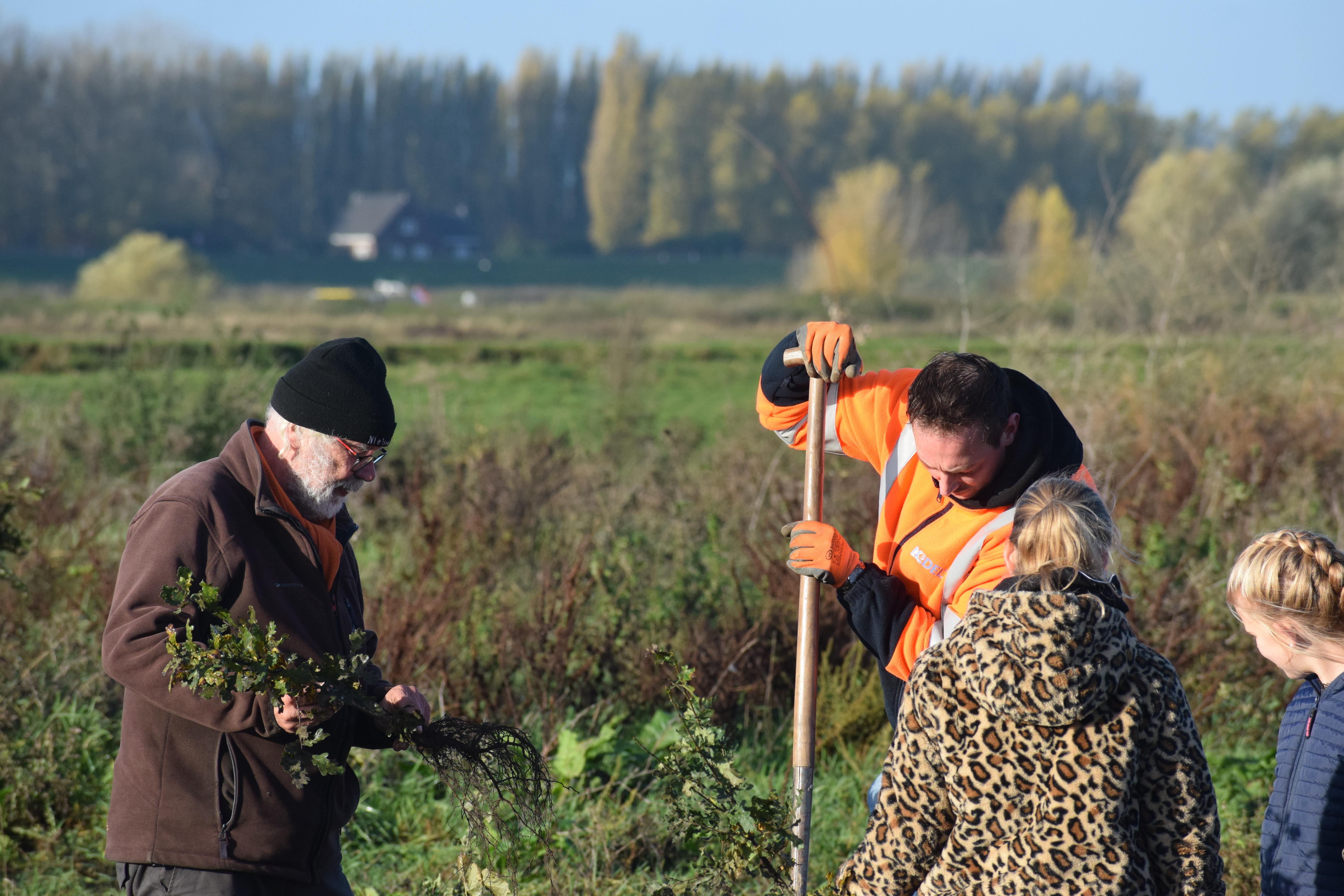 Het zijn nu nog dunne stengels, maar straks vind je ten noorden van de tijdelijke zandklasseerinstallatie een echt hardhoutooibos. Met het aanplanten van de bomen en struiken versnellen we de ontwikkeling van dit zeldzame bostype in de Nederlandse uiterwaarden.